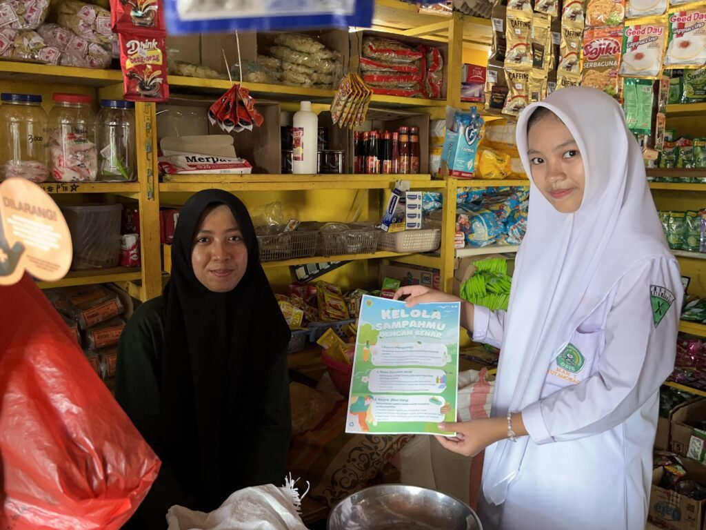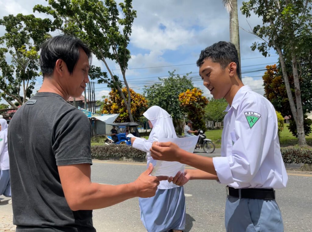Dengan membawa poster-poster kreatif bertuliskan “Pisahkan Sampahmu, Mulai Hari Ini!”, “Ayo kelola sampahmu dengan benar!”, hingga “Daur Ulang Itu Keren!”, para siswa tidak hanya berdiri diam. Mereka membagikan selembaran poster edukatif, menjelaskan cara memilah sampah organik dan anorganik, membagikan tips praktis pengelolaan sampah, seperti membawa tas belanjaan dari rumah, memanfaatkan barang bekas, dan membuat kompos dari sampah organik, yang sukses mencuri perhatian warga.
